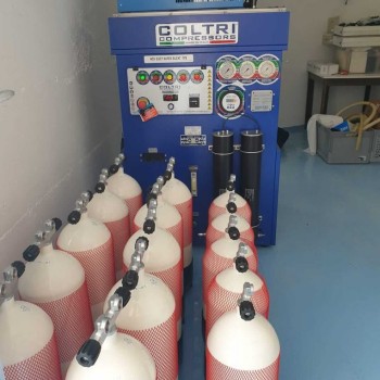 Wir benutzen einen Coltri und einen Bauer Kompressor zum Befüllen der Tauchflaschen. Wir verwenden 12l und 15l Tauchflaschen an der Tauchbasis.